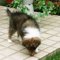 これが、シグナルかどうかは判らないが、真愛珠が初めて芝生に入った時、片足を上げている写真が何枚か有る。この頃、私はシャッタースピードを調節する方法を知らなかったから、歩く瞬間を捉えたのでは無いだろう。 芝生で足が痛いのかな?と思ったけど、どの写真も右前足を上げている。 | |
